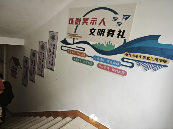 本网消息 近日,电气与电子信息工程学院宿舍楼梯间的文化墙正式亮相。原本简洁的墙面蜕变为集文明引导、学风培育、安全提醒于一体的“立体育人空间”,让“上下楼梯”的碎片化时光化作沉浸式育人课堂,让学生在日常通行中潜移默化浸润文化、涵养良好习惯。